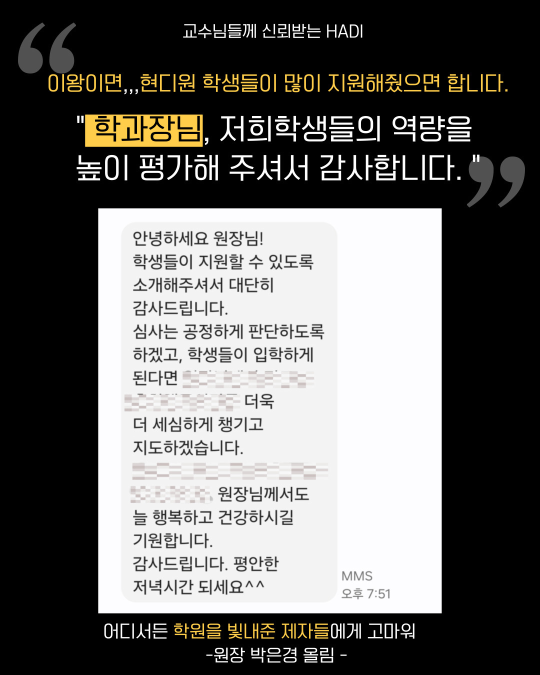 대학교 학과장님께서 실력입증된 현디원 학생들의 많은 지원을 요청하셨습니다. 감사드립니다.